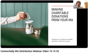 On October 15, 2025, Connectedly held our first webinar! Presented by Connectedly in collaboration with Chase M. Davis, CFP®, CPWA®, ChFC® from Merrill Lynch, the webinar focused on how you can use your IRA’s Required Minimum Distribution (RMD) to support your charitable giving in an innovative, tax-efficient way. In the webinar, Mr. Davis walked through how Qualified Charitable Distributions (QCDs) work, the tax benefits they can provide, and how recent legislation impacts charitable giving today. Mr. Davis also touched on donor-advised funds and how they fit into an overall giving strategy. If you are already inclined towards charitable giving or want to learn how to use your RMD for good, this webinar will help you discover new ways to support your favorite causes while maximizing your retirement assets in a tax-efficient manner.